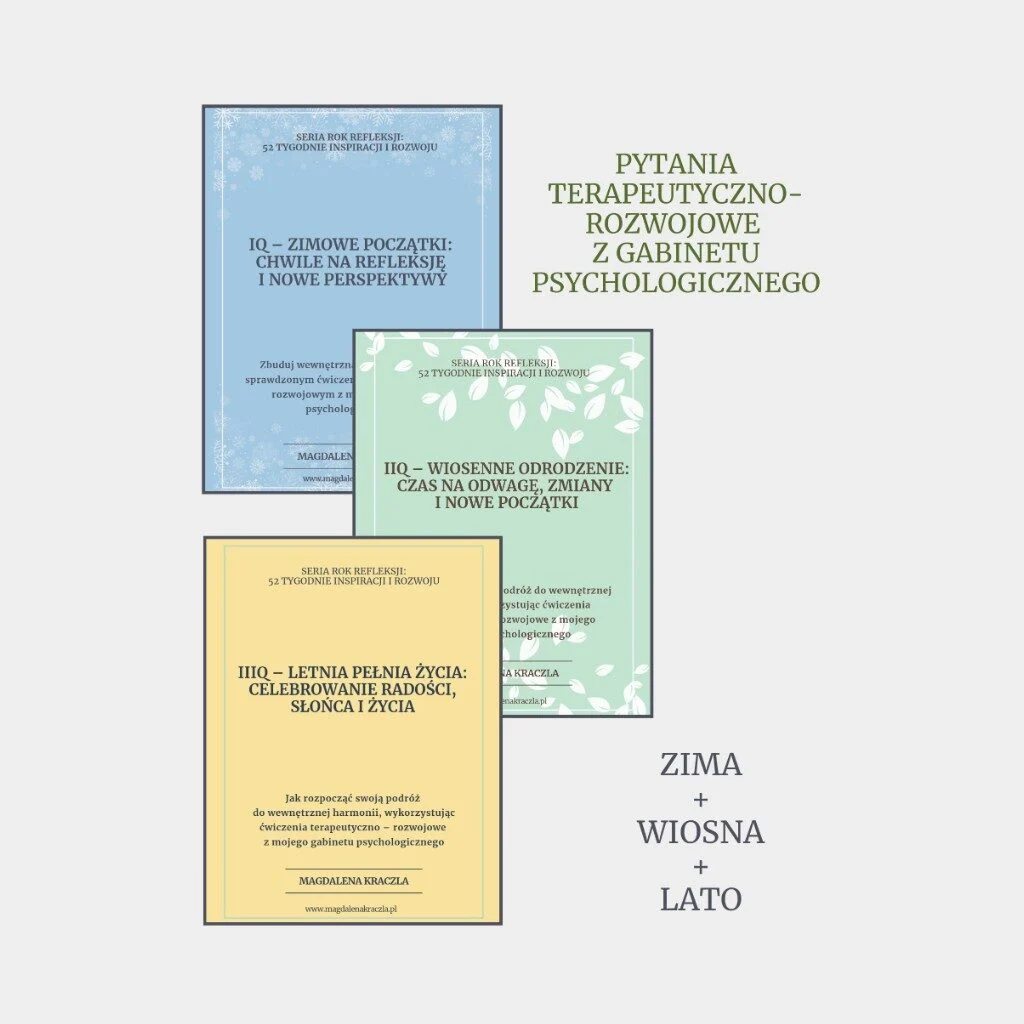 Ten trójpak to 39 tygodni refleksji i aż 117 pytań terapeutyczno-rozwojowych, które możesz które możesz odkrywać we własnym rytmie. Nie musisz się spieszyć! Daj sobie przestrzeń na uważność i głębsze przeżywanie. Ten zestaw jest dla tych, którzy chcą żyć w zgodzie ze sobą, naturą i rytmem, który naprawdę coś w życiu zmienia na lepsze.